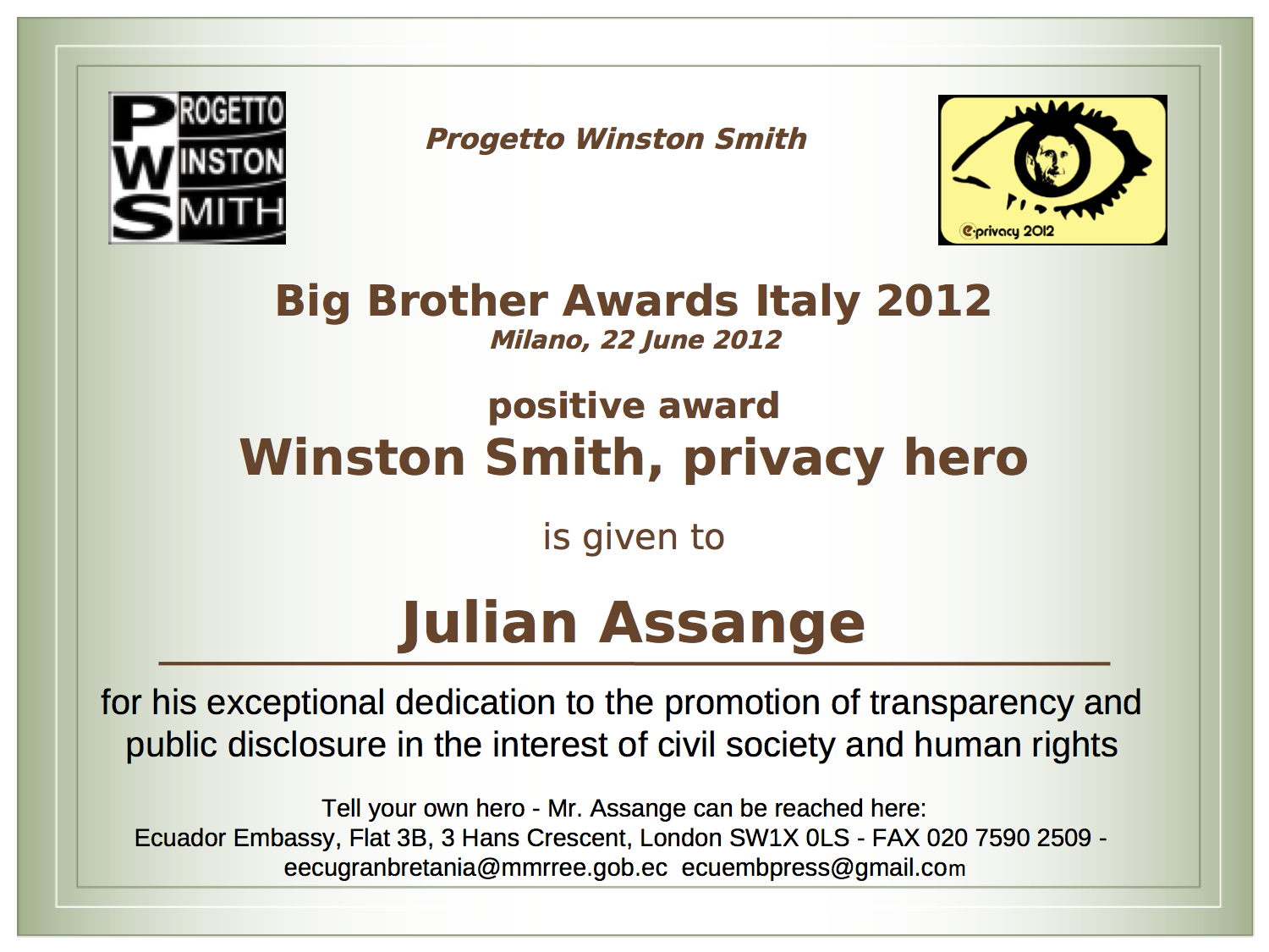 "Eroe della privacy 2012" viene assegnato a Julian Assange, per